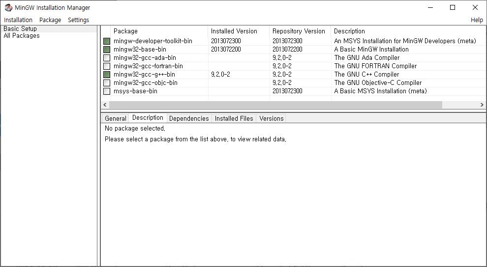 ingw-developer-tookit-bin, mingw32-base-bin, mingw32-gcc-g++-bin 정도 선태해 주면 됩니다.