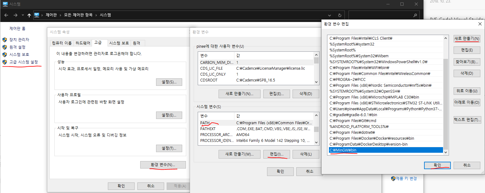 탐색기>내컴퓨터 속성> 고급시스템설정 > 환경 변수 > PATH > 편집 > 새로만들기 > C:\MinGW\bin > 확인