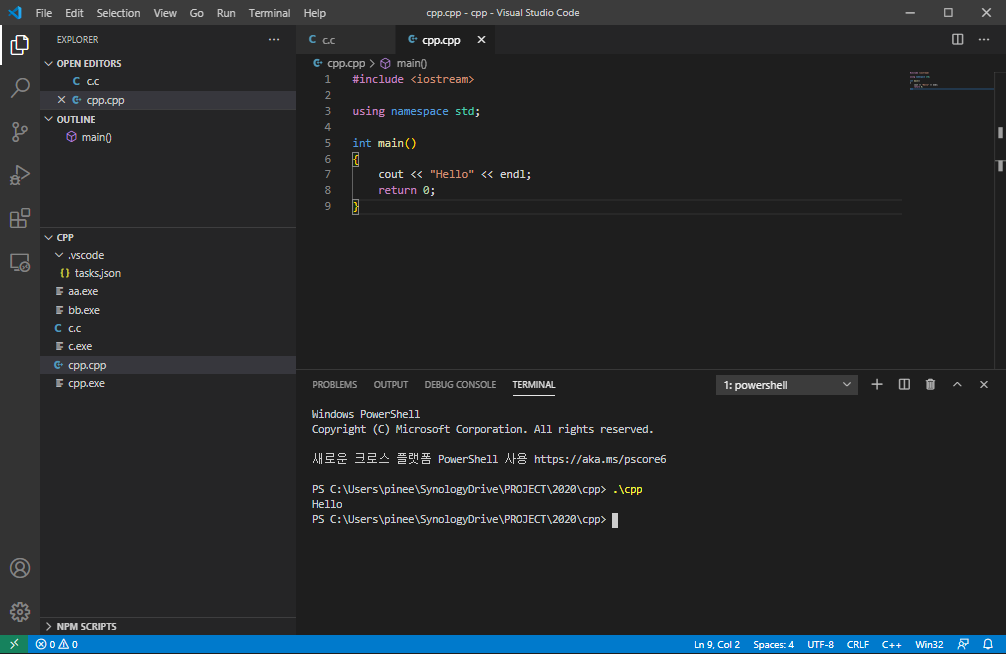 위 화면에서 cpp.cpp파일 cpp.exe을 볼수 있고 Terminal에서 cpp.exe실행하여 결과를 볼수 있어요.
