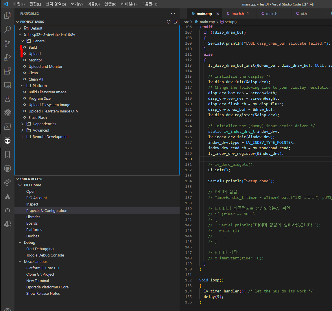 우선 SquareLine Studio의 기본 예제와 LCD 기본 예제를 혼합하여 동작 시켜보도록 하겠습니다.