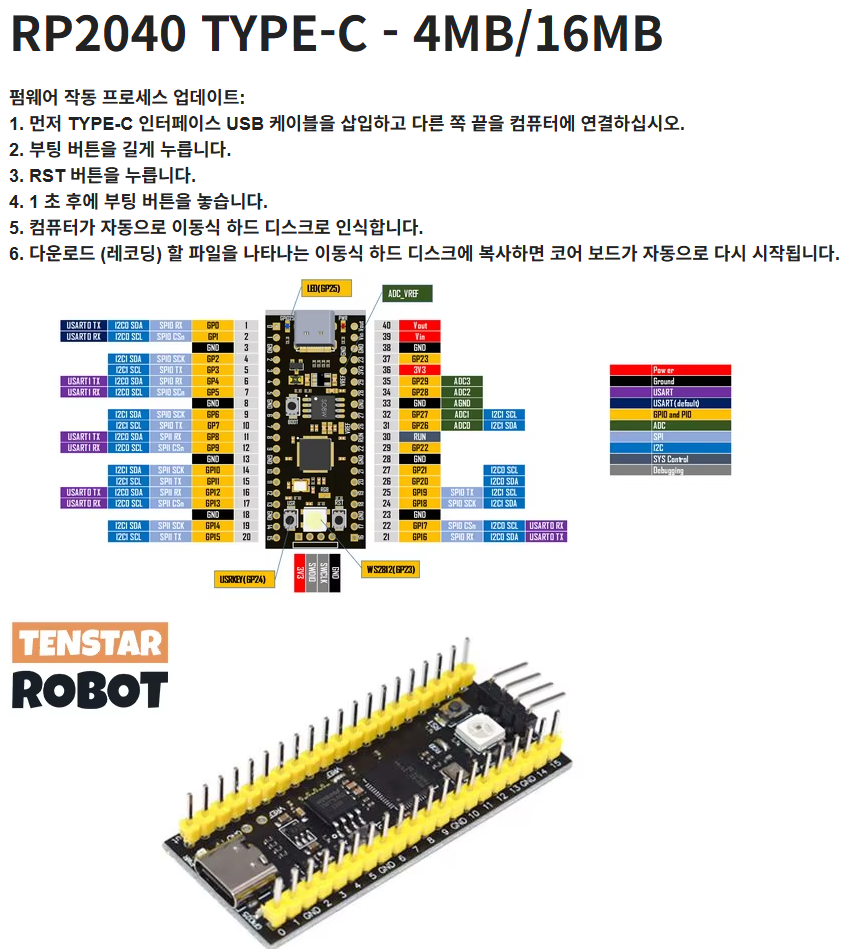 - RP2040 칩셋 탑재 (Dual-core ARM Cortex-M0+)