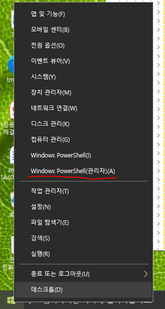 1) 파워쉘 관리자 권한 시작. (윈도우 버튼 우클릭)
