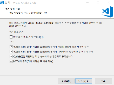 VS Code를 설치할 때 메뉴 옵션에서 "상황에 맞는 메뉴에 추가" 를 선택해 주시면 됩니다.