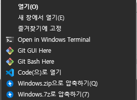 폴더단위로 편집을 하는 VSCode의 경우 탐색기에서 오른쪽 마우스에 등록이 되어 있으면 편하게 원하는 위치에서 시작이 가능합니다. Open with code 등록하기