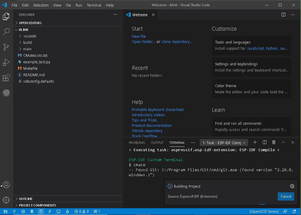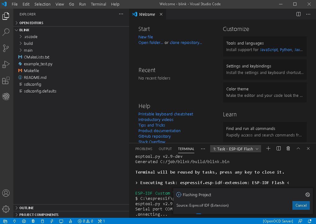 View->Command Paletee... 를 선택하여 "ESP-IDF: Show Examples Projects" 선택하여 blink 를 선택