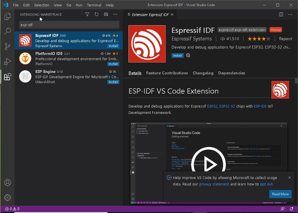 Extensions에서 esp-idf를 검색하여 설치합니다.