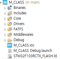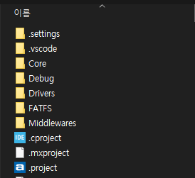 프로젝트 명이 있고 아래 Core라는 소스 파일과, Drivers, FATFS, Middlewares 라는 폴더안에 소스와 라이브러리 소스들이 모두 포함되어 있습니다.
