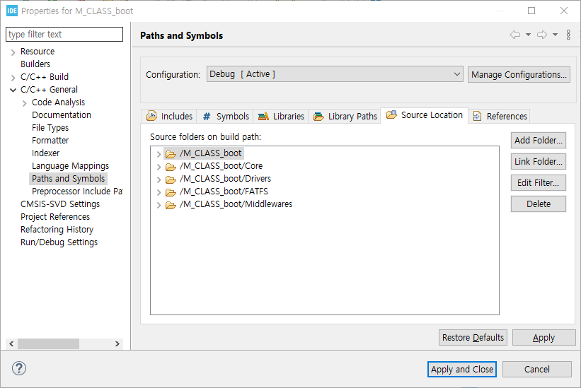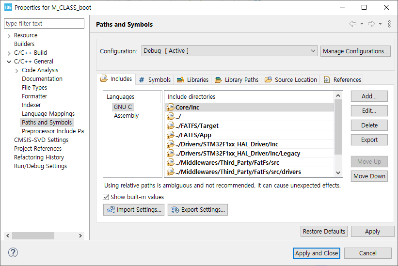 경로가 변경되었으니 위 사진에서처럼. FATFS, Drivers, Middlewares 폴더의 위치에 "../"을 추가하여 결로를 정리해 줍니다.